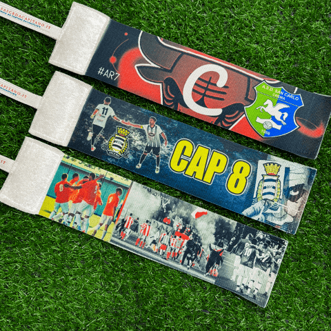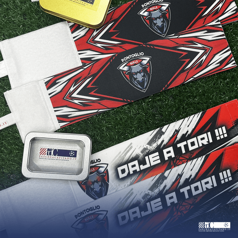 Banner promozionale in italiano con sfondo blu e bordi rossi. A sinistra, logo di WhatsApp e testo: 'Scrivici su WhatsApp' in bianco e verde. Segue: 'Per avere una anteprima grafica della tua fascia da capitano personalizzata', con le parole 'anteprima', 'fascia' e 'da capitano personalizzata' evidenziate in rosso. In basso, un pulsante bianco con bordo rosso e scritta 'CLICCA QUI'. A destra, il braccio di un calciatore con maglia rossa e fascia da capitano nei colori della bandiera italiana (verde, bianco e rosso) con la lettera 'C' blu.